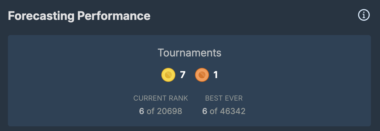I'm currently 28th all time on the Manifold leaderboard, which puts me in 6th out of the 10 finalists (crazy competition). However, I'm also the 6th all-time winningest forecaster on Metaculus, despite only forecasting seriously on that platform for about 1.5 years: